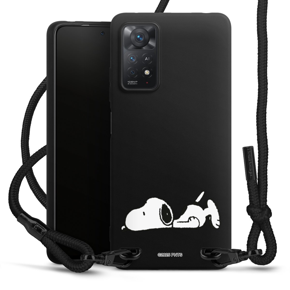 The matt black silicone case is made of flexible TPU (thermoplastic polyurethane) and offers robust protection. The durable, unbreakable material makes the cover flexible and dimensionally stable at the same time. The matte surface makes your design stand out more and is less susceptible to fingerprints and dirt. The stylish trend accessory fits comfortably in the hand and is perfectly complemented by the fabric (polyester) mobile phone strap. The braided fabric strap is approx. 1.70 metres long with a diameter of approx. 0.5 cm. Due to the special knotting technique, the length of the strap can be adjusted by simply pulling it, so that you can adapt it individually to your wishes. The practical case to wear around your neck is available with the fabric strap in black. As a little icing on the cake, we have provided the strap with a chic metal fastener in matt black. The strap is securely fastened to the case with loops made of high-quality genuine leather and press studs. The ends of the fabric strap are covered with metallic end caps and thus protected from fraying.