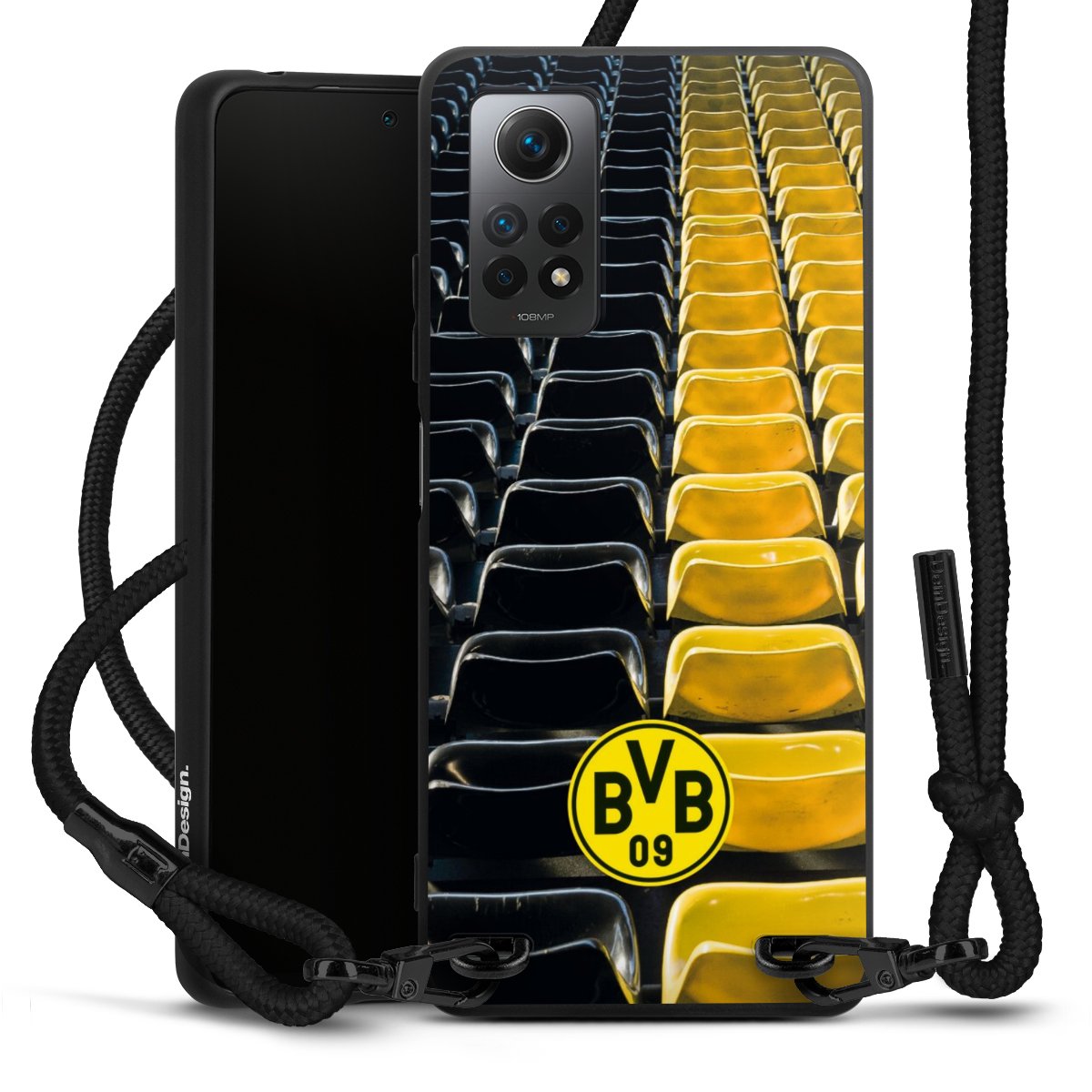 The matt black silicone case is made of flexible TPU (thermoplastic polyurethane) and offers robust protection. The durable, unbreakable material makes the cover flexible and dimensionally stable at the same time. The matte surface makes your design stand out more and is less susceptible to fingerprints and dirt. The stylish trend accessory fits comfortably in the hand and is perfectly complemented by the fabric (polyester) mobile phone strap. The braided fabric strap is approx. 1.70 metres long with a diameter of approx. 0.5 cm. Due to the special knotting technique, the length of the strap can be adjusted by simply pulling it, so that you can adapt it individually to your wishes. The practical case to wear around your neck is available with the fabric strap in black. As a little icing on the cake, we have provided the strap with a chic metal fastener in matt black. The strap is securely fastened to the case with loops made of high-quality genuine leather and press studs. The ends of the fabric strap are covered with metallic end caps and thus protected from fraying.