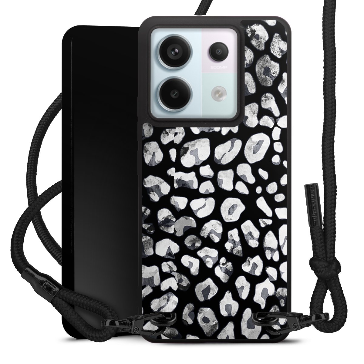 The matt black silicone case is made of flexible TPU (thermoplastic polyurethane) and offers robust protection. The durable, unbreakable material makes the cover flexible and dimensionally stable at the same time. The matte surface makes your design stand out more and is less susceptible to fingerprints and dirt. The stylish trend accessory fits comfortably in the hand and is perfectly complemented by the fabric (polyester) mobile phone strap. The braided fabric strap is approx. 1.70 metres long with a diameter of approx. 0.5 cm. Due to the special knotting technique, the length of the strap can be adjusted by simply pulling it, so that you can adapt it individually to your wishes. The practical case to wear around your neck is available with the fabric strap in black. As a little icing on the cake, we have provided the strap with a chic metal fastener in matt black. The strap is securely fastened to the case with loops made of high-quality genuine leather and press studs. The ends of the fabric strap are covered with metallic end caps and thus protected from fraying.