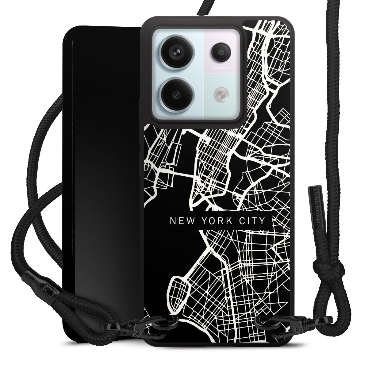 The matt black silicone case is made of flexible TPU (thermoplastic polyurethane) and offers robust protection. The durable, unbreakable material makes the cover flexible and dimensionally stable at the same time. The matte surface makes your design stand out more and is less susceptible to fingerprints and dirt. The stylish trend accessory fits comfortably in the hand and is perfectly complemented by the fabric (polyester) mobile phone strap. The braided fabric strap is approx. 1.70 metres long with a diameter of approx. 0.5 cm. Due to the special knotting technique, the length of the strap can be adjusted by simply pulling it, so that you can adapt it individually to your wishes. The practical case to wear around your neck is available with the fabric strap in black. As a little icing on the cake, we have provided the strap with a chic metal fastener in matt black. The strap is securely fastened to the case with loops made of high-quality genuine leather and press studs. The ends of the fabric strap are covered with metallic end caps and thus protected from fraying.