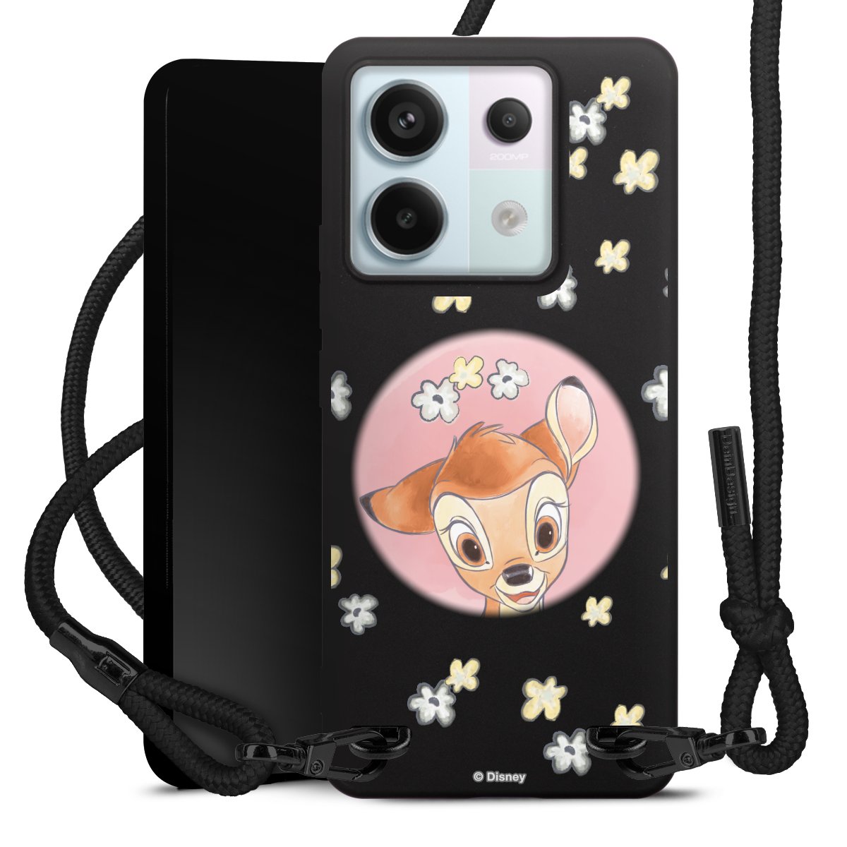The matt black silicone case is made of flexible TPU (thermoplastic polyurethane) and offers robust protection. The durable, unbreakable material makes the cover flexible and dimensionally stable at the same time. The matte surface makes your design stand out more and is less susceptible to fingerprints and dirt. The stylish trend accessory fits comfortably in the hand and is perfectly complemented by the fabric (polyester) mobile phone strap. The braided fabric strap is approx. 1.70 metres long with a diameter of approx. 0.5 cm. Due to the special knotting technique, the length of the strap can be adjusted by simply pulling it, so that you can adapt it individually to your wishes. The practical case to wear around your neck is available with the fabric strap in black. As a little icing on the cake, we have provided the strap with a chic metal fastener in matt black. The strap is securely fastened to the case with loops made of high-quality genuine leather and press studs. The ends of the fabric strap are covered with metallic end caps and thus protected from fraying.