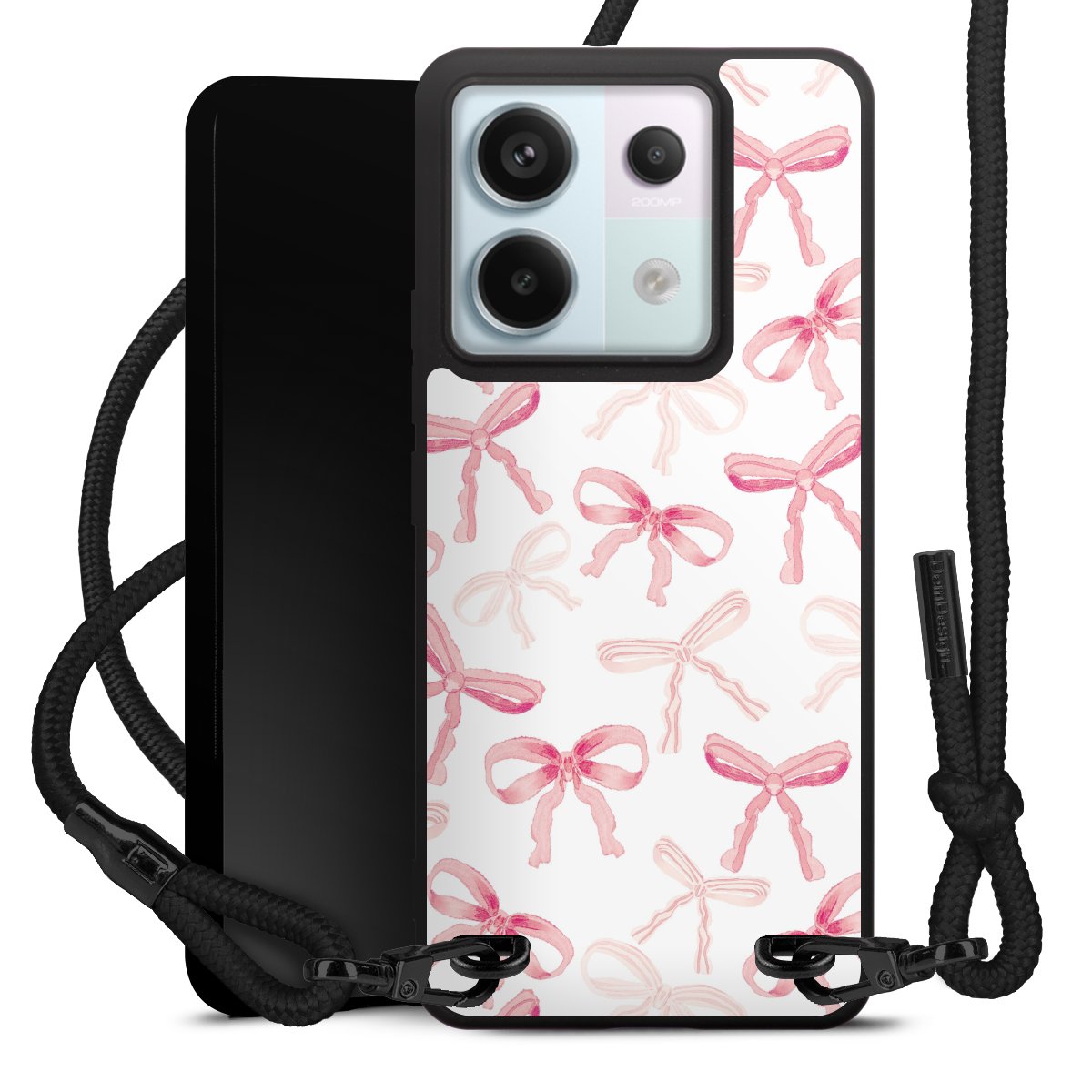 The matt black silicone case is made of flexible TPU (thermoplastic polyurethane) and offers robust protection. The durable, unbreakable material makes the cover flexible and dimensionally stable at the same time. The matte surface makes your design stand out more and is less susceptible to fingerprints and dirt. The stylish trend accessory fits comfortably in the hand and is perfectly complemented by the fabric (polyester) mobile phone strap. The braided fabric strap is approx. 1.70 metres long with a diameter of approx. 0.5 cm. Due to the special knotting technique, the length of the strap can be adjusted by simply pulling it, so that you can adapt it individually to your wishes. The practical case to wear around your neck is available with the fabric strap in black. As a little icing on the cake, we have provided the strap with a chic metal fastener in matt black. The strap is securely fastened to the case with loops made of high-quality genuine leather and press studs. The ends of the fabric strap are covered with metallic end caps and thus protected from fraying.