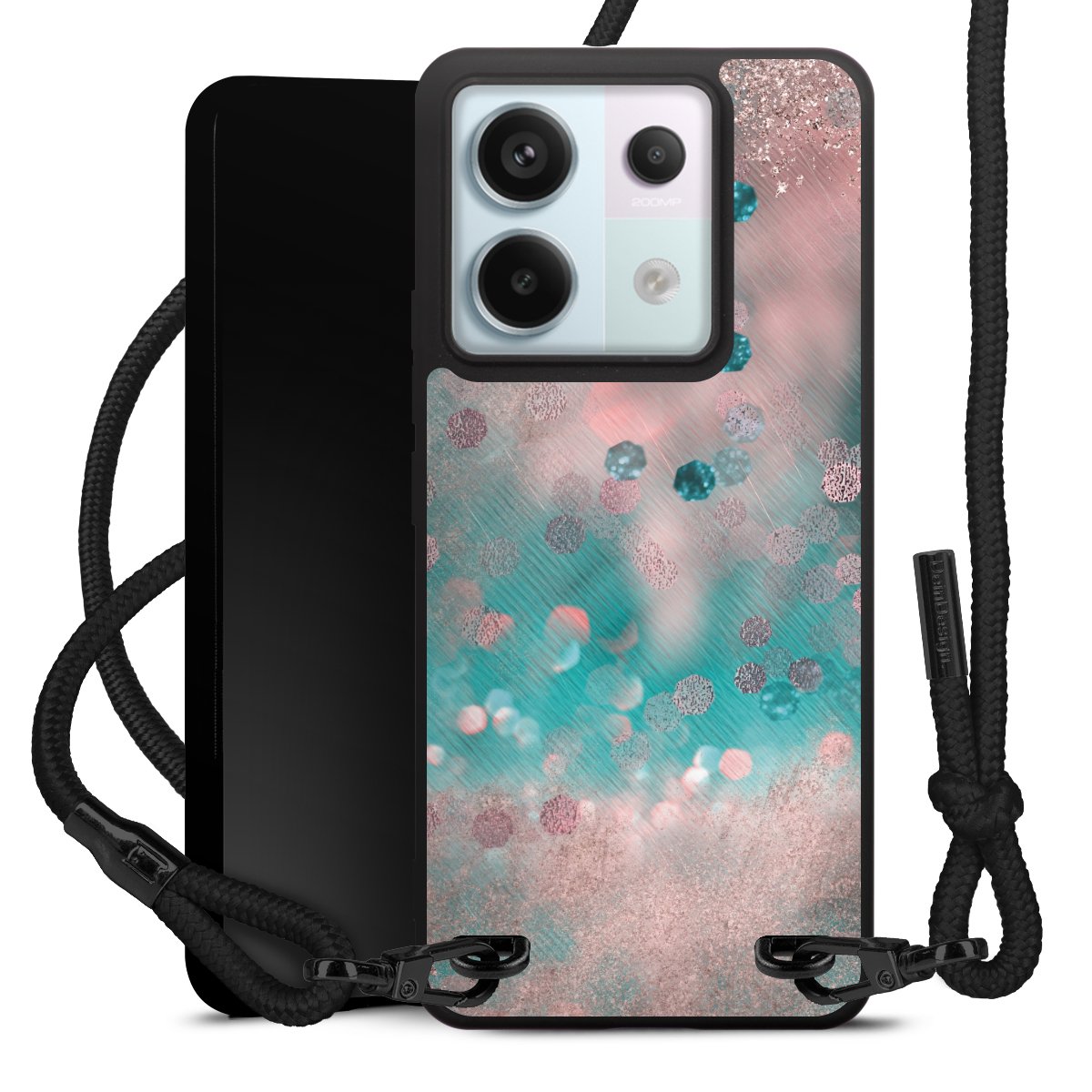 The matt black silicone case is made of flexible TPU (thermoplastic polyurethane) and offers robust protection. The durable, unbreakable material makes the cover flexible and dimensionally stable at the same time. The matte surface makes your design stand out more and is less susceptible to fingerprints and dirt. The stylish trend accessory fits comfortably in the hand and is perfectly complemented by the fabric (polyester) mobile phone strap. The braided fabric strap is approx. 1.70 metres long with a diameter of approx. 0.5 cm. Due to the special knotting technique, the length of the strap can be adjusted by simply pulling it, so that you can adapt it individually to your wishes. The practical case to wear around your neck is available with the fabric strap in black. As a little icing on the cake, we have provided the strap with a chic metal fastener in matt black. The strap is securely fastened to the case with loops made of high-quality genuine leather and press studs. The ends of the fabric strap are covered with metallic end caps and thus protected from fraying.