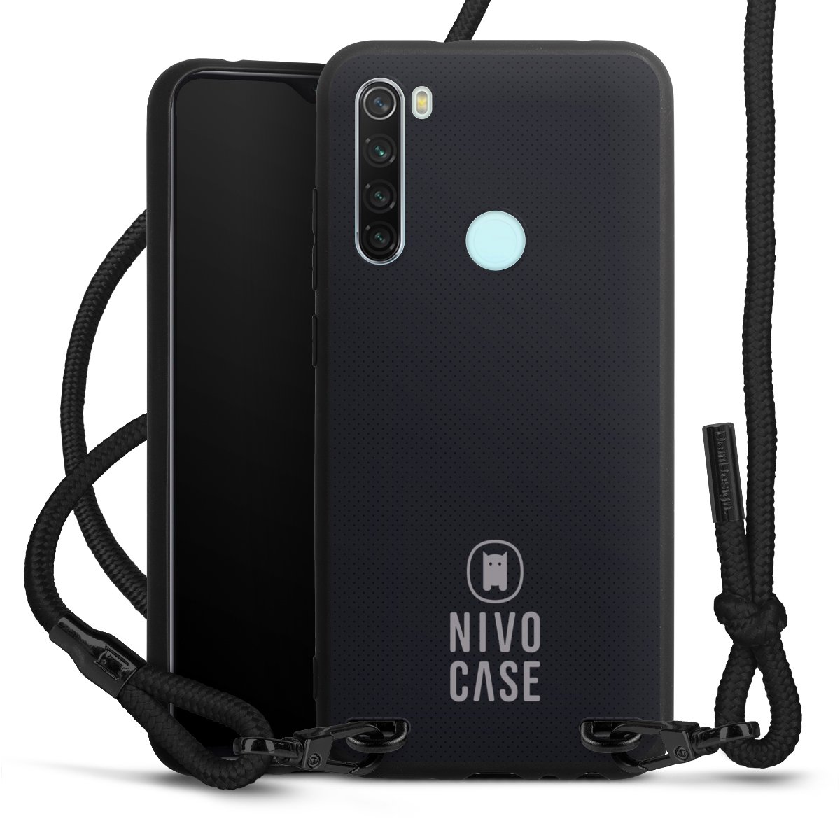 The matt black silicone case is made of flexible TPU (thermoplastic polyurethane) and offers robust protection. The durable, unbreakable material makes the cover flexible and dimensionally stable at the same time. The matte surface makes your design stand out more and is less susceptible to fingerprints and dirt. The stylish trend accessory fits comfortably in the hand and is perfectly complemented by the fabric (polyester) mobile phone strap. The braided fabric strap is approx. 1.70 metres long with a diameter of approx. 0.5 cm. Due to the special knotting technique, the length of the strap can be adjusted by simply pulling it, so that you can adapt it individually to your wishes. The practical case to wear around your neck is available with the fabric strap in black. As a little icing on the cake, we have provided the strap with a chic metal fastener in matt black. The strap is securely fastened to the case with loops made of high-quality genuine leather and press studs. The ends of the fabric strap are covered with metallic end caps and thus protected from fraying.