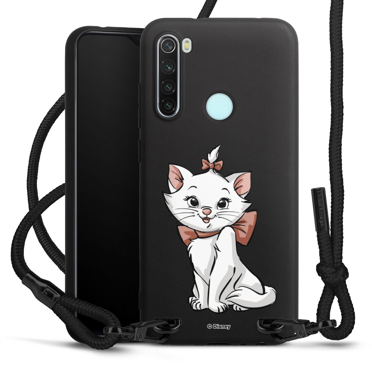 The matt black silicone case is made of flexible TPU (thermoplastic polyurethane) and offers robust protection. The durable, unbreakable material makes the cover flexible and dimensionally stable at the same time. The matte surface makes your design stand out more and is less susceptible to fingerprints and dirt. The stylish trend accessory fits comfortably in the hand and is perfectly complemented by the fabric (polyester) mobile phone strap. The braided fabric strap is approx. 1.70 metres long with a diameter of approx. 0.5 cm. Due to the special knotting technique, the length of the strap can be adjusted by simply pulling it, so that you can adapt it individually to your wishes. The practical case to wear around your neck is available with the fabric strap in black. As a little icing on the cake, we have provided the strap with a chic metal fastener in matt black. The strap is securely fastened to the case with loops made of high-quality genuine leather and press studs. The ends of the fabric strap are covered with metallic end caps and thus protected from fraying.
