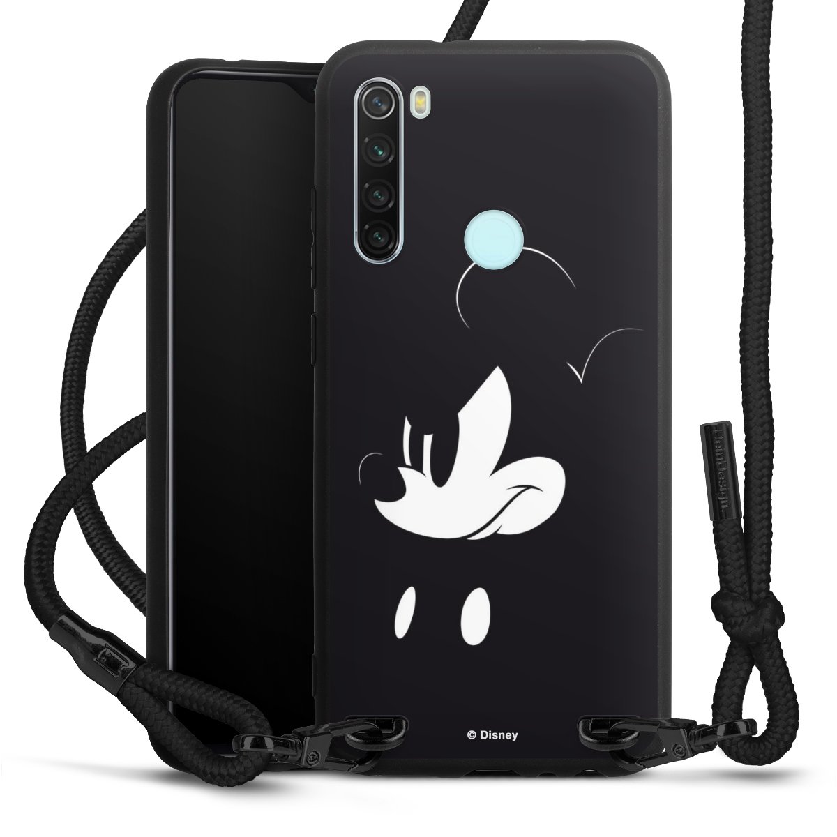 The matt black silicone case is made of flexible TPU (thermoplastic polyurethane) and offers robust protection. The durable, unbreakable material makes the cover flexible and dimensionally stable at the same time. The matte surface makes your design stand out more and is less susceptible to fingerprints and dirt. The stylish trend accessory fits comfortably in the hand and is perfectly complemented by the fabric (polyester) mobile phone strap. The braided fabric strap is approx. 1.70 metres long with a diameter of approx. 0.5 cm. Due to the special knotting technique, the length of the strap can be adjusted by simply pulling it, so that you can adapt it individually to your wishes. The practical case to wear around your neck is available with the fabric strap in black. As a little icing on the cake, we have provided the strap with a chic metal fastener in matt black. The strap is securely fastened to the case with loops made of high-quality genuine leather and press studs. The ends of the fabric strap are covered with metallic end caps and thus protected from fraying.