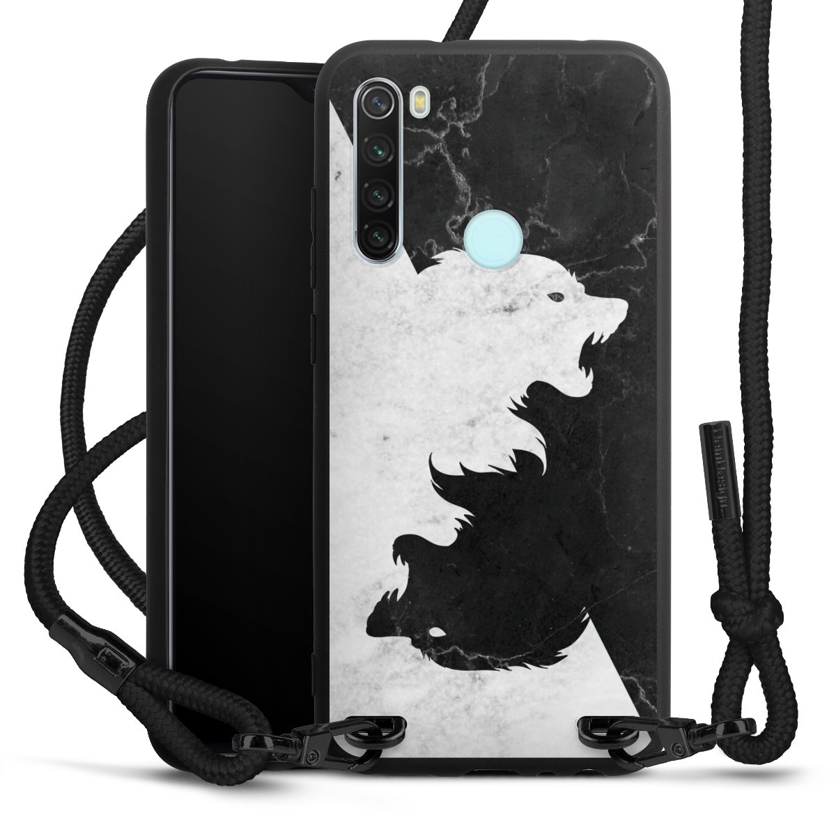 The matt black silicone case is made of flexible TPU (thermoplastic polyurethane) and offers robust protection. The durable, unbreakable material makes the cover flexible and dimensionally stable at the same time. The matte surface makes your design stand out more and is less susceptible to fingerprints and dirt. The stylish trend accessory fits comfortably in the hand and is perfectly complemented by the fabric (polyester) mobile phone strap. The braided fabric strap is approx. 1.70 metres long with a diameter of approx. 0.5 cm. Due to the special knotting technique, the length of the strap can be adjusted by simply pulling it, so that you can adapt it individually to your wishes. The practical case to wear around your neck is available with the fabric strap in black. As a little icing on the cake, we have provided the strap with a chic metal fastener in matt black. The strap is securely fastened to the case with loops made of high-quality genuine leather and press studs. The ends of the fabric strap are covered with metallic end caps and thus protected from fraying.
