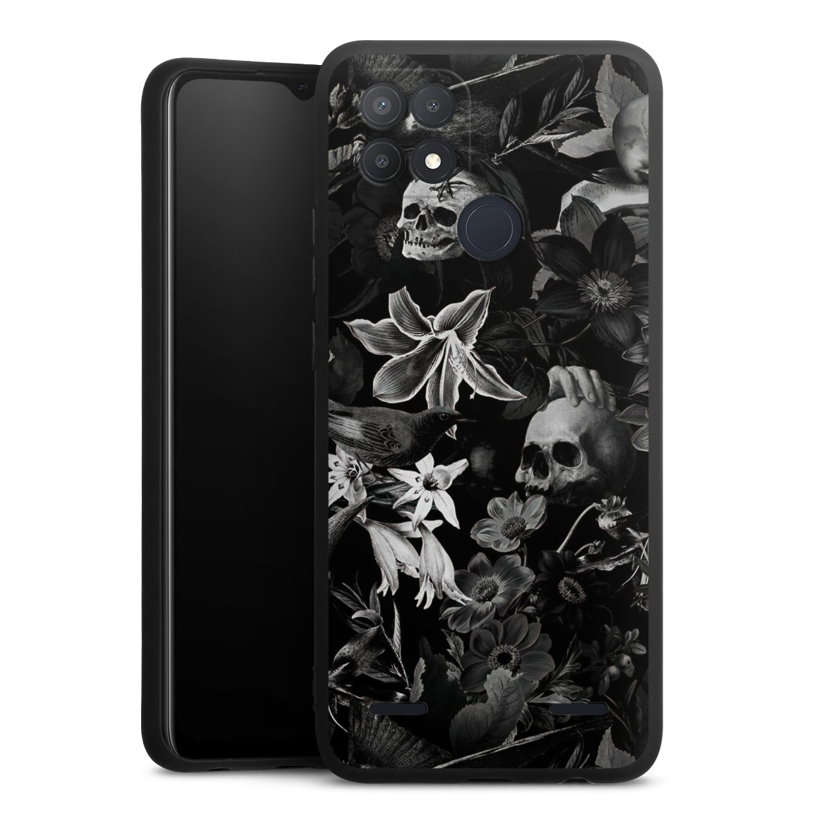 Skulls and Flowers on Black Background