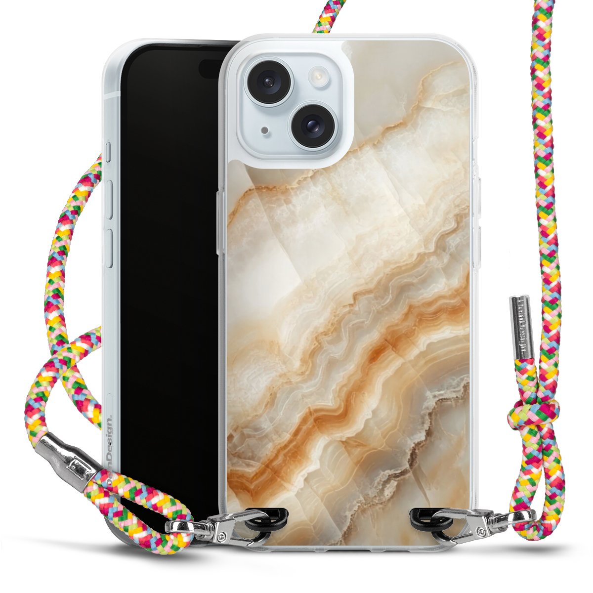 The flexible case is made from a highquality TPU material (thermoplastic Polyurethan). Thanks to its longlasting and break resistant characterisitcs, the case is flexible yet consistent in form and has a great grip and feel. The textile strap made from Polyester gives a chic yet casual accent allowing you to carry your phone like a bag or necklace - a practical gadget perfect for your next adventure. The textile strap is about 1.70 meters long and the length can easily be adjusted through the knots. Our Carry Case is available in Colourful, Mint-Camouflage, Very-Berry, Sahara-Sand and Sparkling-Neon. The ends of the textile strap are covered with metallic end caps to protect them against fraying.