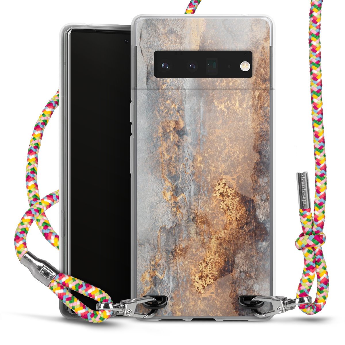 The flexible case is made from a highquality TPU material (thermoplastic Polyurethan). Thanks to its longlasting and break resistant characterisitcs, the case is flexible yet consistent in form and has a great grip and feel. The textile strap made from Polyester gives a chic yet casual accent allowing you to carry your phone like a bag or necklace - a practical gadget perfect for your next adventure. The textile strap is about 1.70 meters long and the length can easily be adjusted through the knots. Our Carry Case is available in Colourful, Mint-Camouflage, Very-Berry, Sahara-Sand and Sparkling-Neon. The ends of the textile strap are covered with metallic end caps to protect them against fraying.