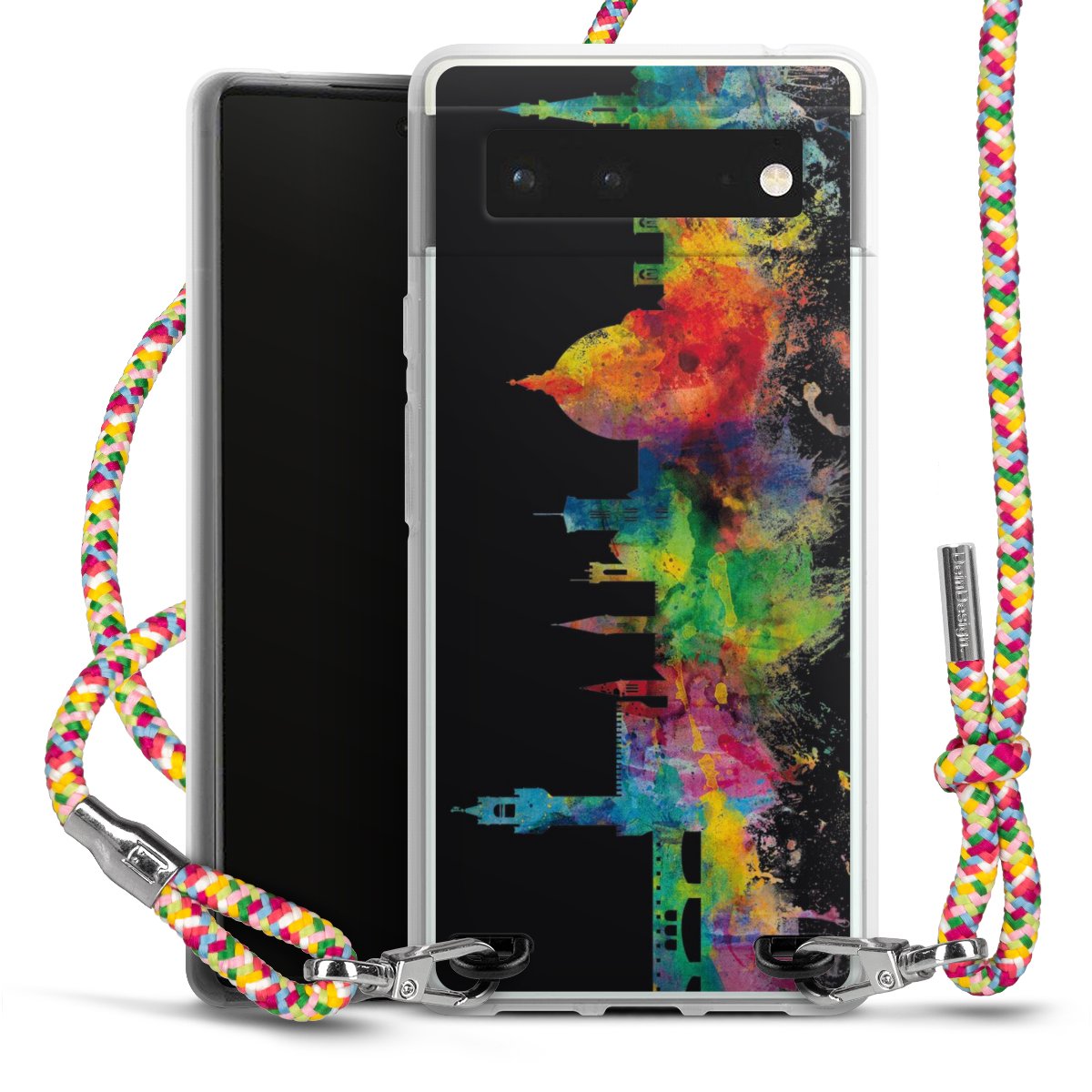 The flexible case is made from a highquality TPU material (thermoplastic Polyurethan). Thanks to its longlasting and break resistant characterisitcs, the case is flexible yet consistent in form and has a great grip and feel. The textile strap made from Polyester gives a chic yet casual accent allowing you to carry your phone like a bag or necklace - a practical gadget perfect for your next adventure. The textile strap is about 1.70 meters long and the length can easily be adjusted through the knots. Our Carry Case is available in Colourful, Mint-Camouflage, Very-Berry, Sahara-Sand and Sparkling-Neon. The ends of the textile strap are covered with metallic end caps to protect them against fraying.