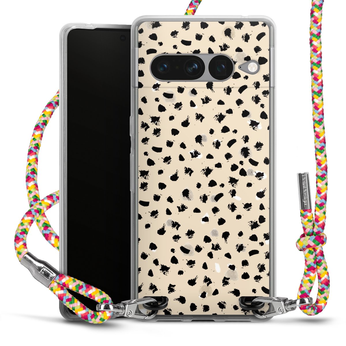 The flexible case is made from a highquality TPU material (thermoplastic Polyurethan). Thanks to its longlasting and break resistant characterisitcs, the case is flexible yet consistent in form and has a great grip and feel. The textile strap made from Polyester gives a chic yet casual accent allowing you to carry your phone like a bag or necklace - a practical gadget perfect for your next adventure. The textile strap is about 1.70 meters long and the length can easily be adjusted through the knots. Our Carry Case is available in Colourful, Mint-Camouflage, Very-Berry, Sahara-Sand and Sparkling-Neon. The ends of the textile strap are covered with metallic end caps to protect them against fraying.