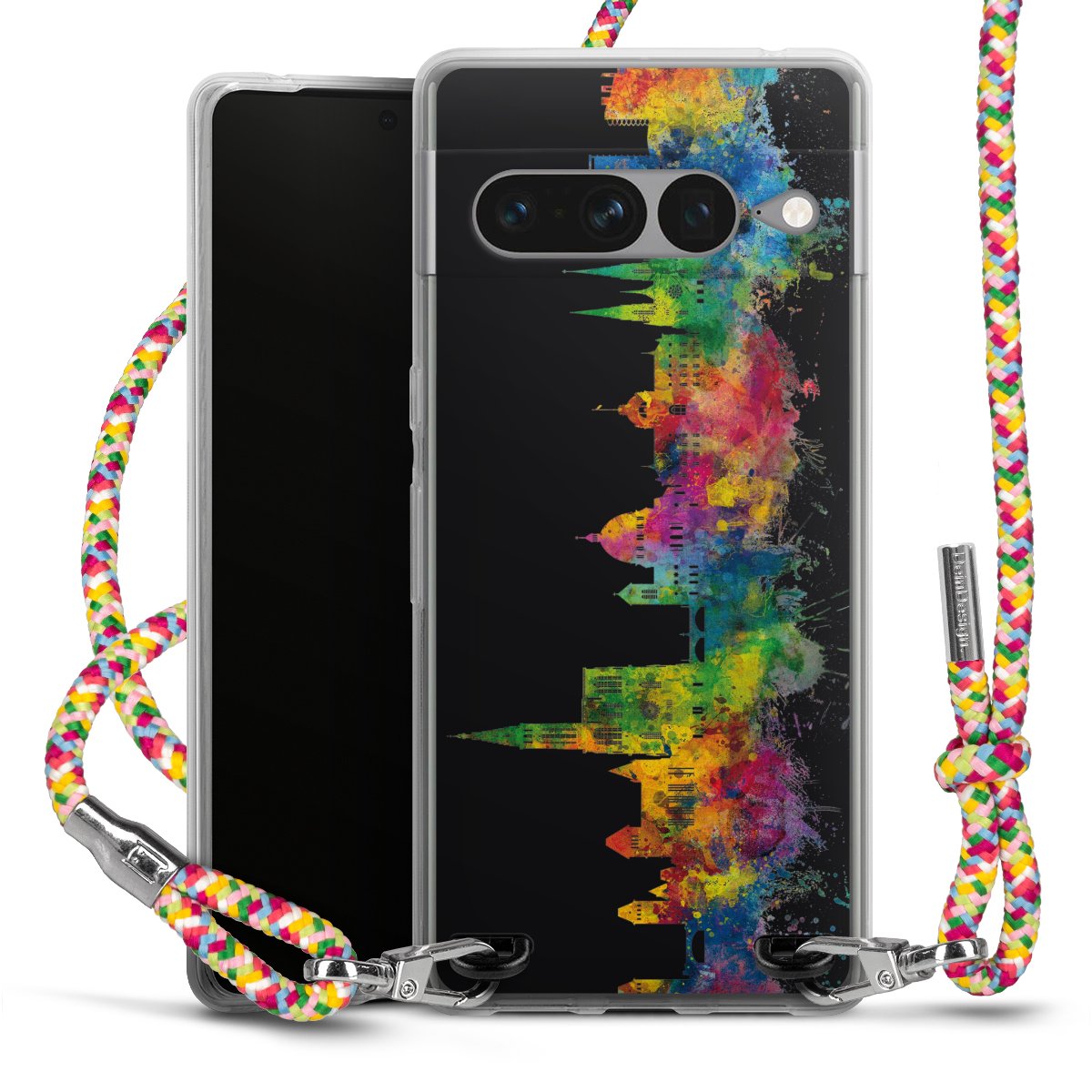 The flexible case is made from a highquality TPU material (thermoplastic Polyurethan). Thanks to its longlasting and break resistant characterisitcs, the case is flexible yet consistent in form and has a great grip and feel. The textile strap made from Polyester gives a chic yet casual accent allowing you to carry your phone like a bag or necklace - a practical gadget perfect for your next adventure. The textile strap is about 1.70 meters long and the length can easily be adjusted through the knots. Our Carry Case is available in Colourful, Mint-Camouflage, Very-Berry, Sahara-Sand and Sparkling-Neon. The ends of the textile strap are covered with metallic end caps to protect them against fraying.