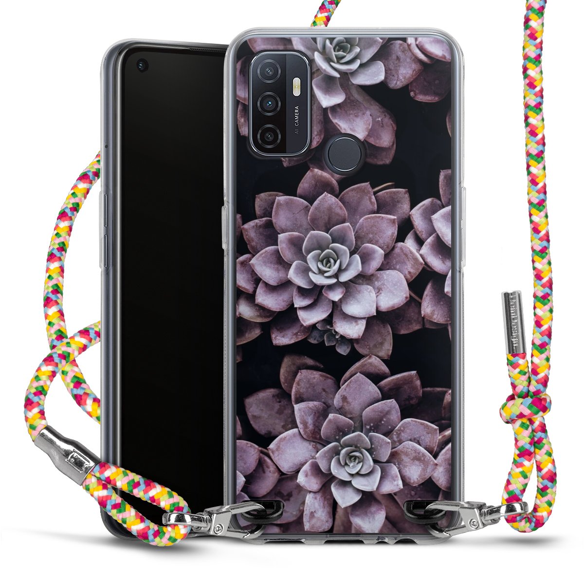 The flexible case is made from a highquality TPU material (thermoplastic Polyurethan). Thanks to its longlasting and break resistant characterisitcs, the case is flexible yet consistent in form and has a great grip and feel. The textile strap made from Polyester gives a chic yet casual accent allowing you to carry your phone like a bag or necklace - a practical gadget perfect for your next adventure. The textile strap is about 1.70 meters long and the length can easily be adjusted through the knots. Our Carry Case is available in Colourful, Mint-Camouflage, Very-Berry, Sahara-Sand and Sparkling-Neon. The ends of the textile strap are covered with metallic end caps to protect them against fraying.