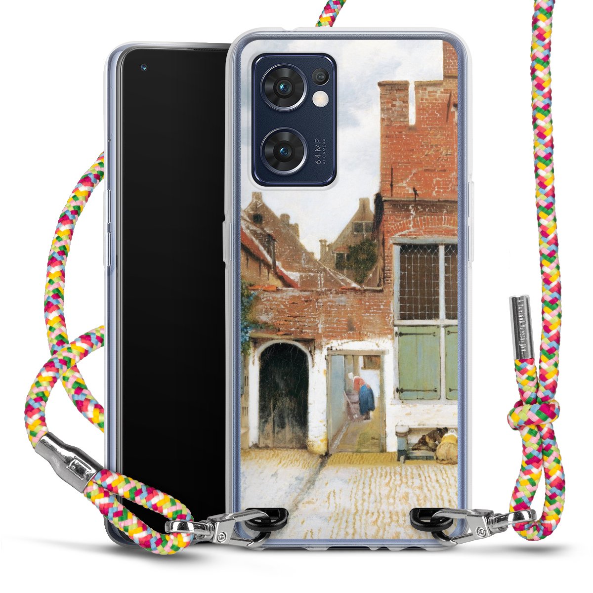 The flexible case is made from a highquality TPU material (thermoplastic Polyurethan). Thanks to its longlasting and break resistant characterisitcs, the case is flexible yet consistent in form and has a great grip and feel. The textile strap made from Polyester gives a chic yet casual accent allowing you to carry your phone like a bag or necklace - a practical gadget perfect for your next adventure. The textile strap is about 1.70 meters long and the length can easily be adjusted through the knots. Our Carry Case is available in Colourful, Mint-Camouflage, Very-Berry, Sahara-Sand and Sparkling-Neon. The ends of the textile strap are covered with metallic end caps to protect them against fraying.