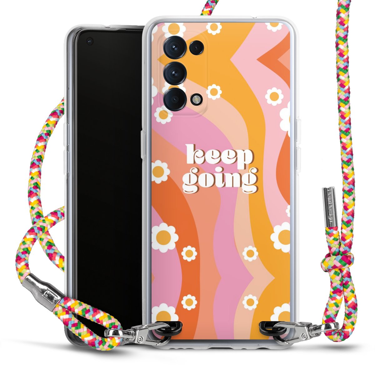 The flexible case is made from a highquality TPU material (thermoplastic Polyurethan). Thanks to its longlasting and break resistant characterisitcs, the case is flexible yet consistent in form and has a great grip and feel. The textile strap made from Polyester gives a chic yet casual accent allowing you to carry your phone like a bag or necklace - a practical gadget perfect for your next adventure. The textile strap is about 1.70 meters long and the length can easily be adjusted through the knots. Our Carry Case is available in Colourful, Mint-Camouflage, Very-Berry, Sahara-Sand and Sparkling-Neon. The ends of the textile strap are covered with metallic end caps to protect them against fraying.