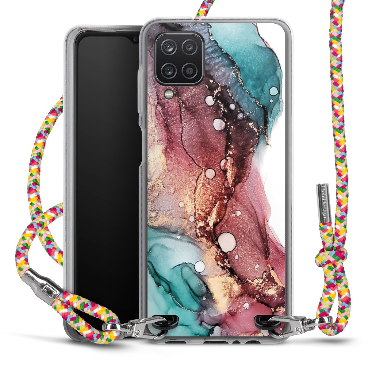 The flexible case is made from a highquality TPU material (thermoplastic Polyurethan). Thanks to its longlasting and break resistant characterisitcs, the case is flexible yet consistent in form and has a great grip and feel. The textile strap made from Polyester gives a chic yet casual accent allowing you to carry your phone like a bag or necklace - a practical gadget perfect for your next adventure. The textile strap is about 1.70 meters long and the length can easily be adjusted through the knots. Our Carry Case is available in Colourful, Mint-Camouflage, Very-Berry, Sahara-Sand and Sparkling-Neon. The ends of the textile strap are covered with metallic end caps to protect them against fraying.