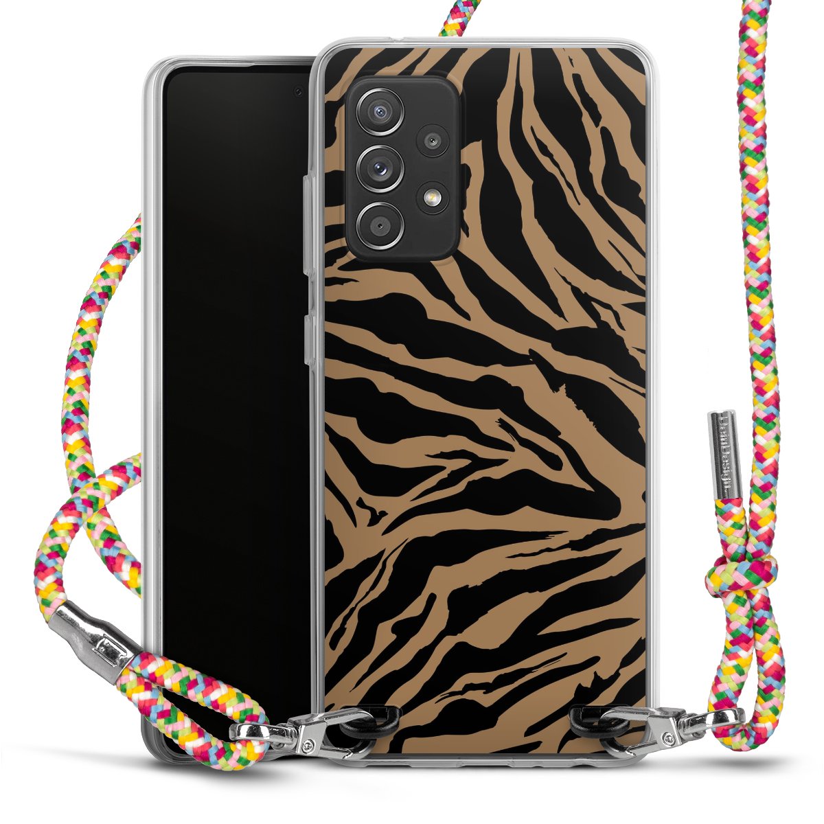 The flexible case is made from a highquality TPU material (thermoplastic Polyurethan). Thanks to its longlasting and break resistant characterisitcs, the case is flexible yet consistent in form and has a great grip and feel. The textile strap made from Polyester gives a chic yet casual accent allowing you to carry your phone like a bag or necklace - a practical gadget perfect for your next adventure. The textile strap is about 1.70 meters long and the length can easily be adjusted through the knots. Our Carry Case is available in Colourful, Mint-Camouflage, Very-Berry, Sahara-Sand and Sparkling-Neon. The ends of the textile strap are covered with metallic end caps to protect them against fraying.