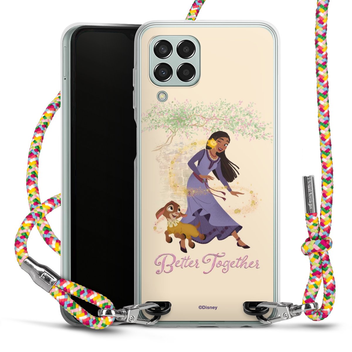 The flexible case is made from a highquality TPU material (thermoplastic Polyurethan). Thanks to its longlasting and break resistant characterisitcs, the case is flexible yet consistent in form and has a great grip and feel. The textile strap made from Polyester gives a chic yet casual accent allowing you to carry your phone like a bag or necklace - a practical gadget perfect for your next adventure. The textile strap is about 1.70 meters long and the length can easily be adjusted through the knots. Our Carry Case is available in Colourful, Mint-Camouflage, Very-Berry, Sahara-Sand and Sparkling-Neon. The ends of the textile strap are covered with metallic end caps to protect them against fraying.
