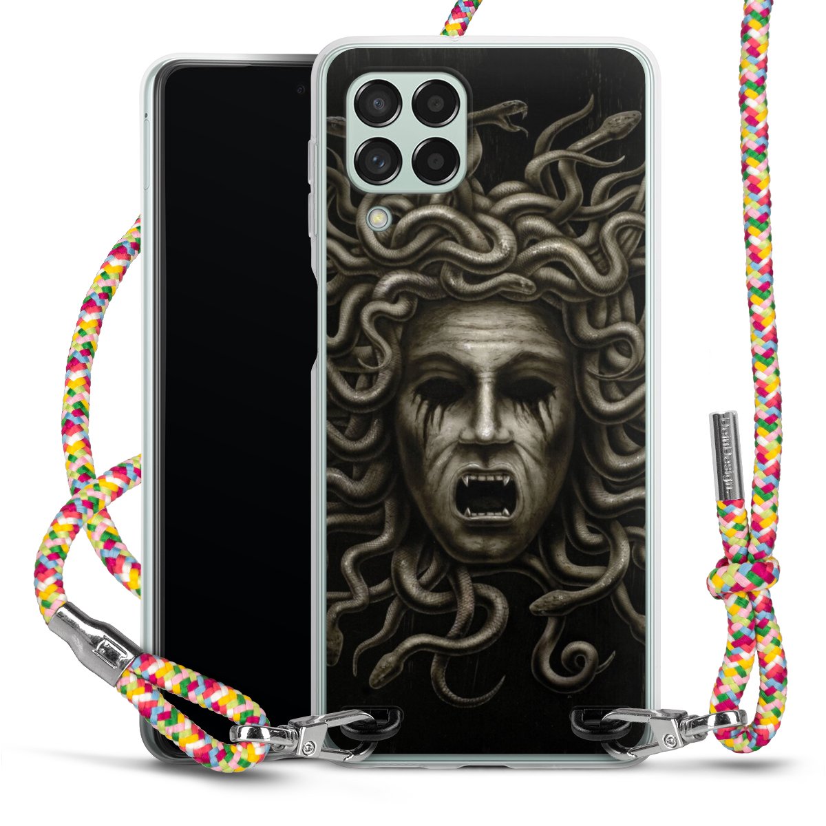 The flexible case is made from a highquality TPU material (thermoplastic Polyurethan). Thanks to its longlasting and break resistant characterisitcs, the case is flexible yet consistent in form and has a great grip and feel. The textile strap made from Polyester gives a chic yet casual accent allowing you to carry your phone like a bag or necklace - a practical gadget perfect for your next adventure. The textile strap is about 1.70 meters long and the length can easily be adjusted through the knots. Our Carry Case is available in Colourful, Mint-Camouflage, Very-Berry, Sahara-Sand and Sparkling-Neon. The ends of the textile strap are covered with metallic end caps to protect them against fraying.