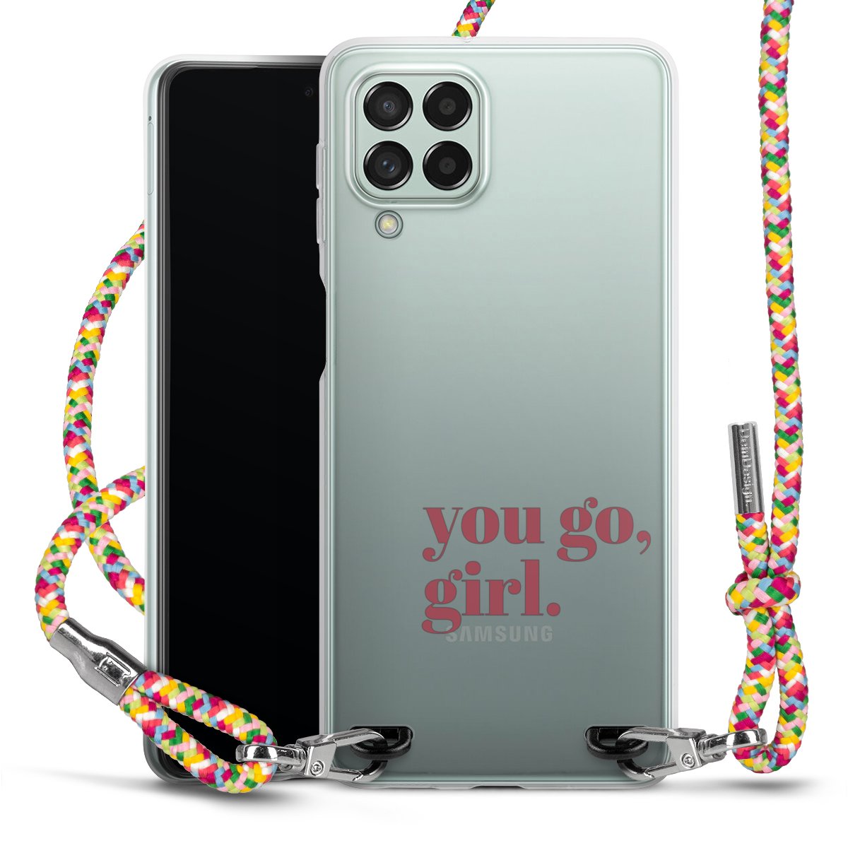 The flexible case is made from a highquality TPU material (thermoplastic Polyurethan). Thanks to its longlasting and break resistant characterisitcs, the case is flexible yet consistent in form and has a great grip and feel. The textile strap made from Polyester gives a chic yet casual accent allowing you to carry your phone like a bag or necklace - a practical gadget perfect for your next adventure. The textile strap is about 1.70 meters long and the length can easily be adjusted through the knots. Our Carry Case is available in Colourful, Mint-Camouflage, Very-Berry, Sahara-Sand and Sparkling-Neon. The ends of the textile strap are covered with metallic end caps to protect them against fraying.