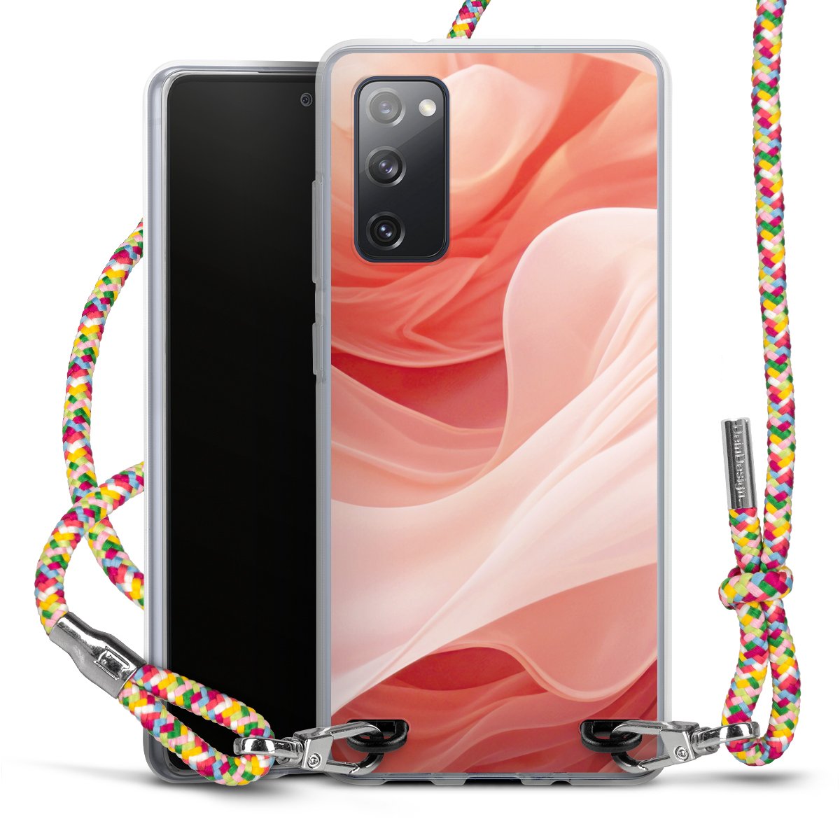 The flexible case is made from a highquality TPU material (thermoplastic Polyurethan). Thanks to its longlasting and break resistant characterisitcs, the case is flexible yet consistent in form and has a great grip and feel. The textile strap made from Polyester gives a chic yet casual accent allowing you to carry your phone like a bag or necklace - a practical gadget perfect for your next adventure. The textile strap is about 1.70 meters long and the length can easily be adjusted through the knots. Our Carry Case is available in Colourful, Mint-Camouflage, Very-Berry, Sahara-Sand and Sparkling-Neon. The ends of the textile strap are covered with metallic end caps to protect them against fraying.