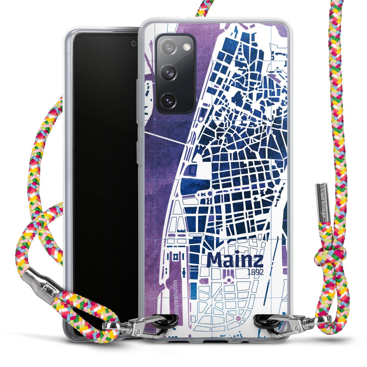 The flexible case is made from a highquality TPU material (thermoplastic Polyurethan). Thanks to its longlasting and break resistant characterisitcs, the case is flexible yet consistent in form and has a great grip and feel. The textile strap made from Polyester gives a chic yet casual accent allowing you to carry your phone like a bag or necklace - a practical gadget perfect for your next adventure. The textile strap is about 1.70 meters long and the length can easily be adjusted through the knots. Our Carry Case is available in Colourful, Mint-Camouflage, Very-Berry, Sahara-Sand and Sparkling-Neon. The ends of the textile strap are covered with metallic end caps to protect them against fraying.