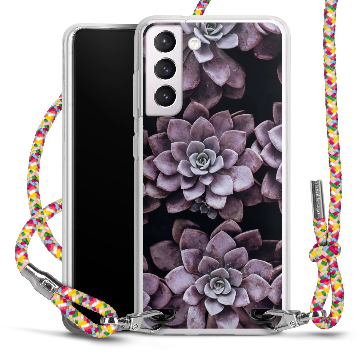 The flexible case is made from a highquality TPU material (thermoplastic Polyurethan). Thanks to its longlasting and break resistant characterisitcs, the case is flexible yet consistent in form and has a great grip and feel. The textile strap made from Polyester gives a chic yet casual accent allowing you to carry your phone like a bag or necklace - a practical gadget perfect for your next adventure. The textile strap is about 1.70 meters long and the length can easily be adjusted through the knots. Our Carry Case is available in Colourful, Mint-Camouflage, Very-Berry, Sahara-Sand and Sparkling-Neon. The ends of the textile strap are covered with metallic end caps to protect them against fraying.