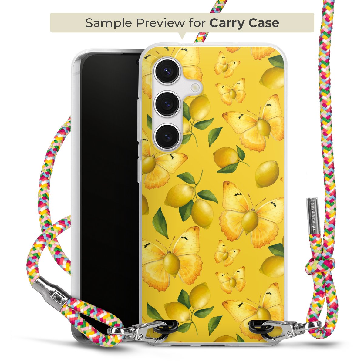 The flexible case is made from a highquality TPU material (thermoplastic Polyurethan). Thanks to its longlasting and break resistant characterisitcs, the case is flexible yet consistent in form and has a great grip and feel. The textile strap made from Polyester gives a chic yet casual accent allowing you to carry your phone like a bag or necklace - a practical gadget perfect for your next adventure. The textile strap is about 1.70 meters long and the length can easily be adjusted through the knots. Our Carry Case is available in Colourful, Mint-Camouflage, Very-Berry, Sahara-Sand and Sparkling-Neon. The ends of the textile strap are covered with metallic end caps to protect them against fraying.