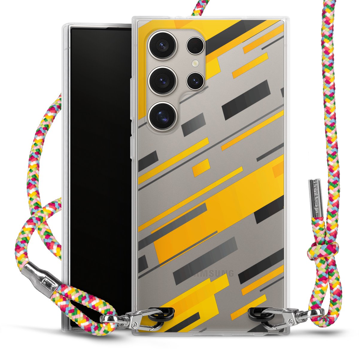 The flexible case is made from a highquality TPU material (thermoplastic Polyurethan). Thanks to its longlasting and break resistant characterisitcs, the case is flexible yet consistent in form and has a great grip and feel. The textile strap made from Polyester gives a chic yet casual accent allowing you to carry your phone like a bag or necklace - a practical gadget perfect for your next adventure. The textile strap is about 1.70 meters long and the length can easily be adjusted through the knots. Our Carry Case is available in Colourful, Mint-Camouflage, Very-Berry, Sahara-Sand and Sparkling-Neon. The ends of the textile strap are covered with metallic end caps to protect them against fraying.