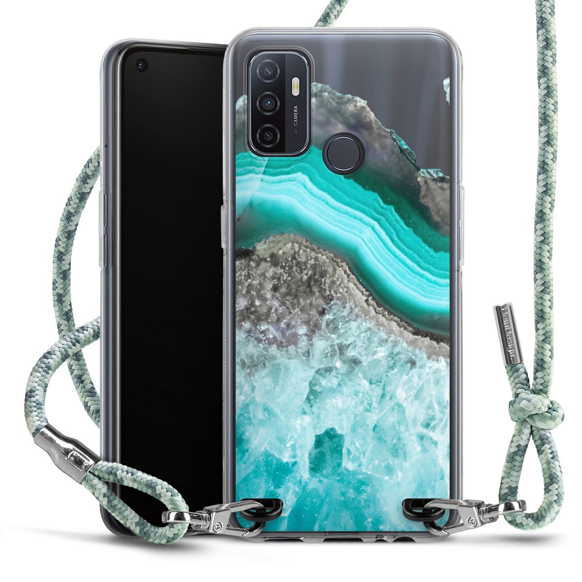 The flexible case is made from a highquality TPU material (thermoplastic Polyurethan). Thanks to its longlasting and break resistant characterisitcs, the case is flexible yet consistent in form and has a great grip and feel. The textile strap made from Polyester gives a chic yet casual accent allowing you to carry your phone like a bag or necklace - a practical gadget perfect for your next adventure. The textile strap is about 1.70 meters long and the length can easily be adjusted through the knots. Our Carry Case is available in Colourful, Mint-Camouflage, Very-Berry, Sahara-Sand and Sparkling-Neon. The ends of the textile strap are covered with metallic end caps to protect them against fraying.