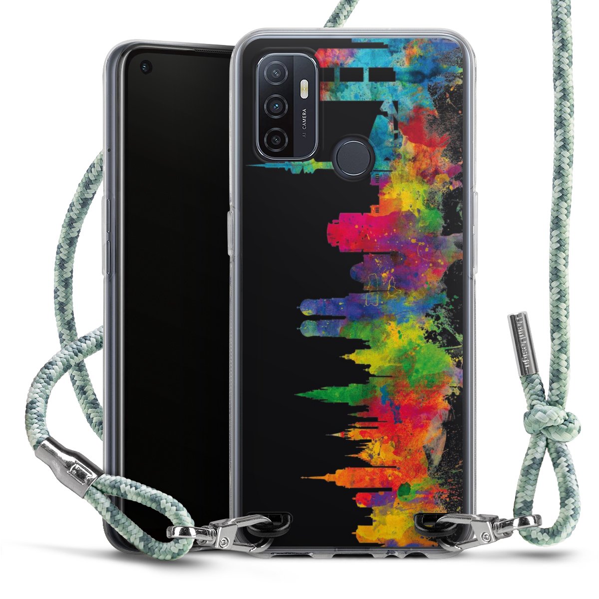 The flexible case is made from a highquality TPU material (thermoplastic Polyurethan). Thanks to its longlasting and break resistant characterisitcs, the case is flexible yet consistent in form and has a great grip and feel. The textile strap made from Polyester gives a chic yet casual accent allowing you to carry your phone like a bag or necklace - a practical gadget perfect for your next adventure. The textile strap is about 1.70 meters long and the length can easily be adjusted through the knots. Our Carry Case is available in Colourful, Mint-Camouflage, Very-Berry, Sahara-Sand and Sparkling-Neon. The ends of the textile strap are covered with metallic end caps to protect them against fraying.